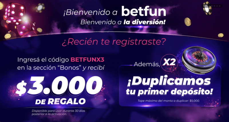 El primer punto en el que nos vamos a fijar es el bono de bienvenida de Betfun apuestas. Esta promoción está disponible solamente para nuevos usuarios. Con el bono Betfun tendrás $3000 de regalo y además duplica tu primer depósit.