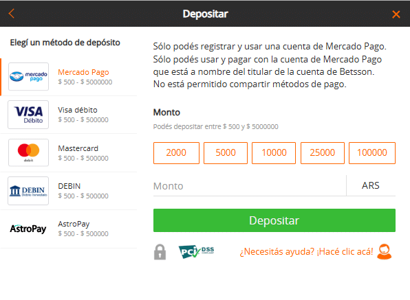 Para los métodos de depósito Betsson sólo es posible registrar y utilizar una cuenta de Mercado Pago a nombre del titular de la cuenta. Además, no está permitido compartir pasarelas de pago.