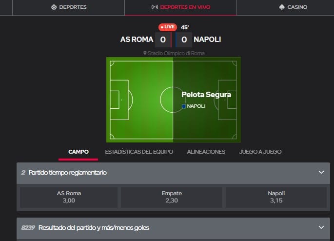 En el campo vas a ver el desarrollo del juego, podés encontrar también las estadísticas, alineaciones y en “juego a juego”, una línea de tiempo con lo destacado de la competencia, todo eso te servirá para poder crear tus estrategias y optar por uno de los mercados de apuestas disponibles.