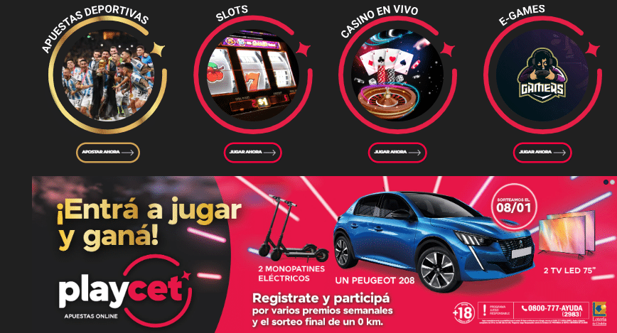 Por el momento no hay un bono de bienvenida al registrarse en Playcet. Sin embargo, para ganar adeptos, con tu inscripción podrás participar de atractivos premios como televisores, monopatines y hasta un auto.