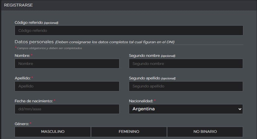 - Una vez que estés dentro de la página web, completá el formulario, lo primero que te van a pedir, pero esto es opcional, es el código referido.